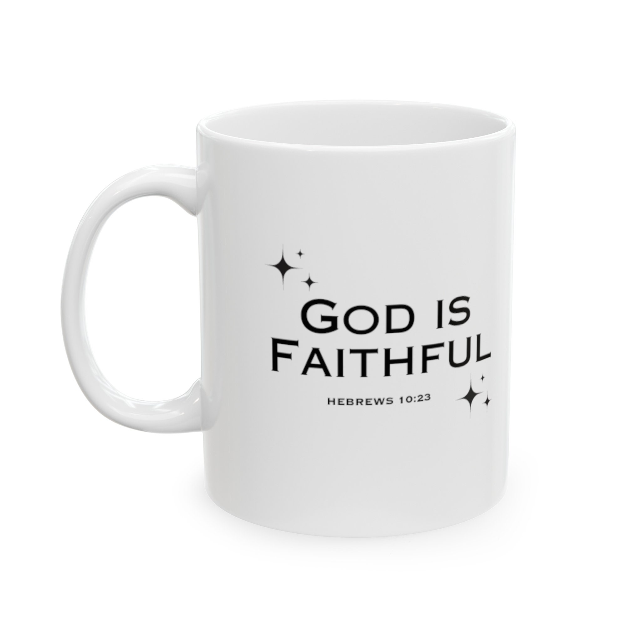 "God is Faithful" ceramic coffee mug features a design with the phrase "God is Faithful" printed on both sides. This mug is intended to serve as a reminder of faith and trust in the Lord, particularly in times of difficulty or uncertainty. The ceramic material makes them durable and suitable for everyday use, and the 11oz size is a standard capacity for coffee mugs, perfect for enjoying your favorite hot or cold beverages. God is Faithful ceramic coffee mug. It’s BPA and Lead-free, microwave & dishwasher-safe, and made of white, durable ceramic in 11-ounce size.