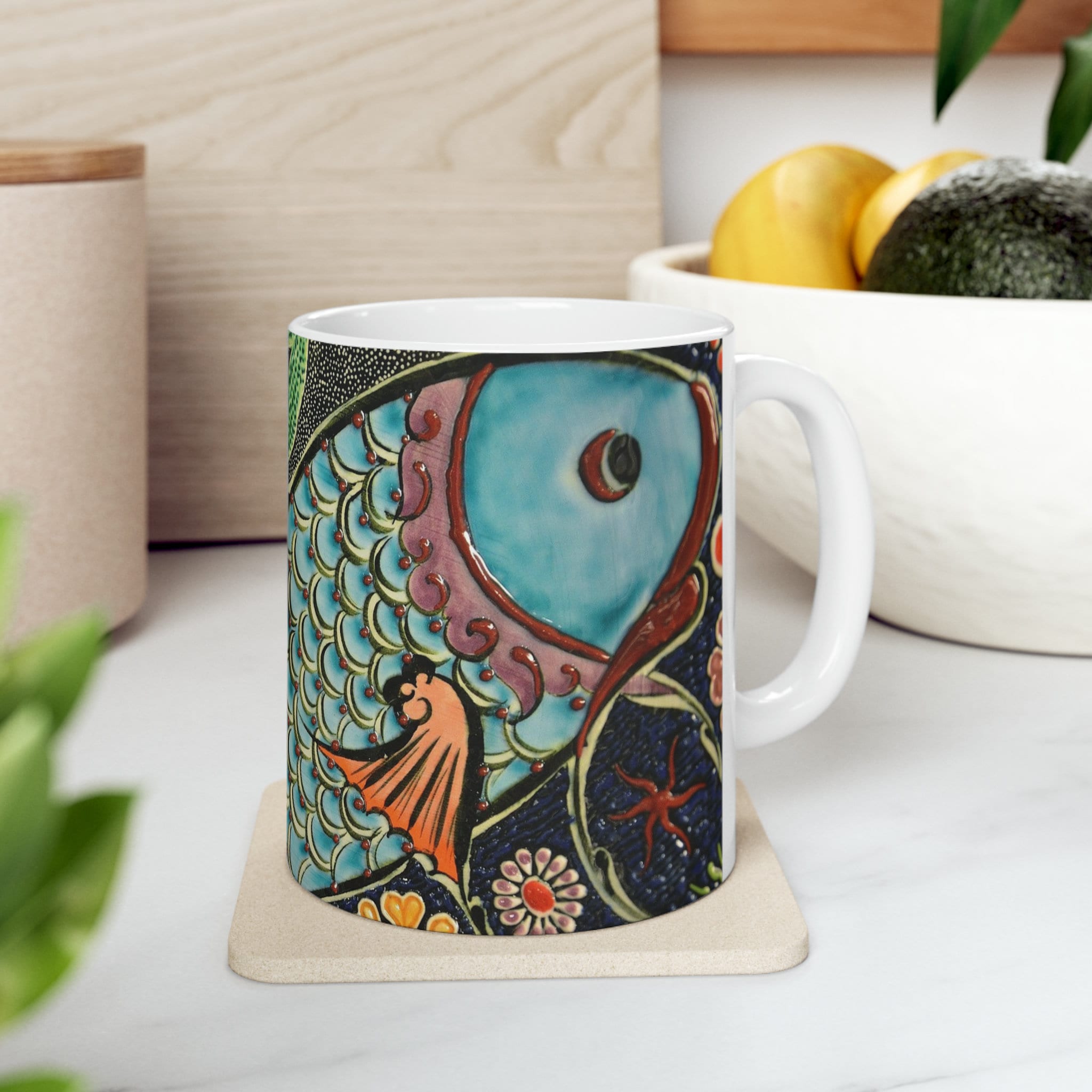 Dive into your morning routine with a splash of vibrant color and whimsical charm courtesy of our Mosaic Fish Ceramic Mug. Crafted with care, this unique mug features a captivating mosaic design, reminiscent of underwater wonders. Each sip is a journey through swirling waters and darting fish, adding a touch of aquatic adventure to your day.